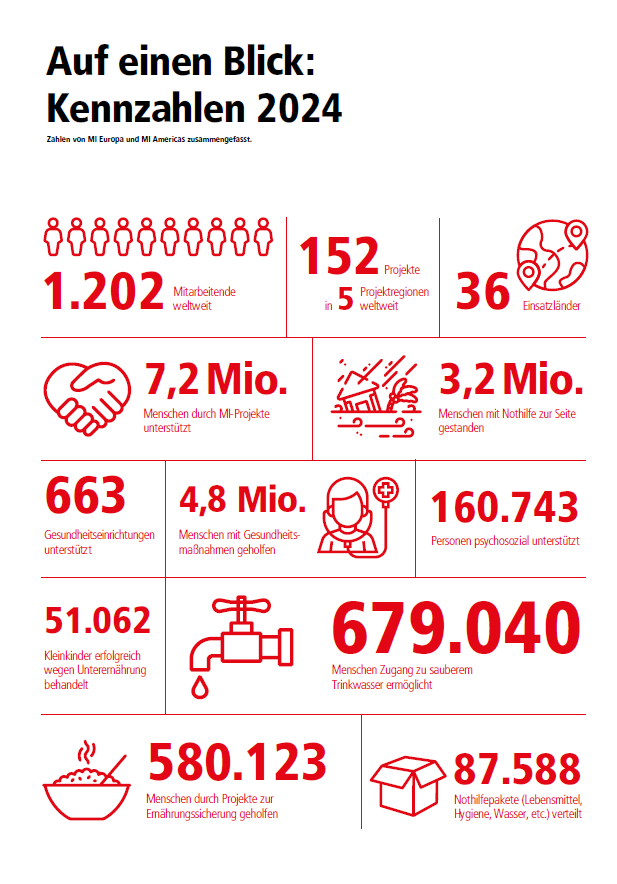 Im Jahr 2024 konnten wir dank Ihrer Unterstützung 7,2 Millionen Menschen in Not in 152 Projekten in 36 Ländern in Afrika, Amerika, Asien und Europa helfen.